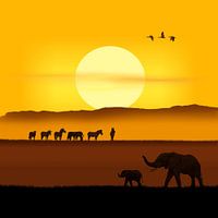 Een kudde zebra's en olifanten bij zonsopgang op de Afrikaanse savanne. Een sfeervolle Afrika motief in levendige geel en bruin.