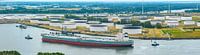 Een olietankschip meert aan in de haven van Rotterdam in Nederland, van bovenaf gezien met olie-opslagsilo's op de achtergrond.