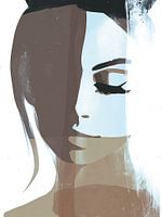gestileerd vrouwenportret, opgedeeld in scherpe vlakken van licht en donker. De linkerhelft van haar gezicht baadt in een diepe bruine schaduw, terwijl de rechterzijde helderblauw oplicht tegen een witte achtergrond. Deze sterke tegenstelling creëert een optisch spel van zichtbaarheid en afwezigheid. Het gezicht lijkt enerzijds…