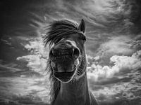 Zwart wit portret van een paard in de le Hable d'Ault, Picardië, frankrijk