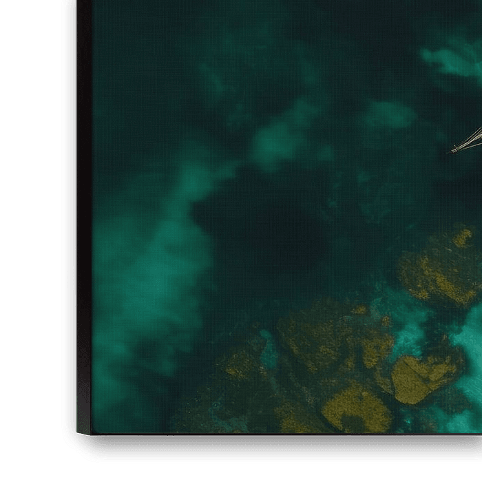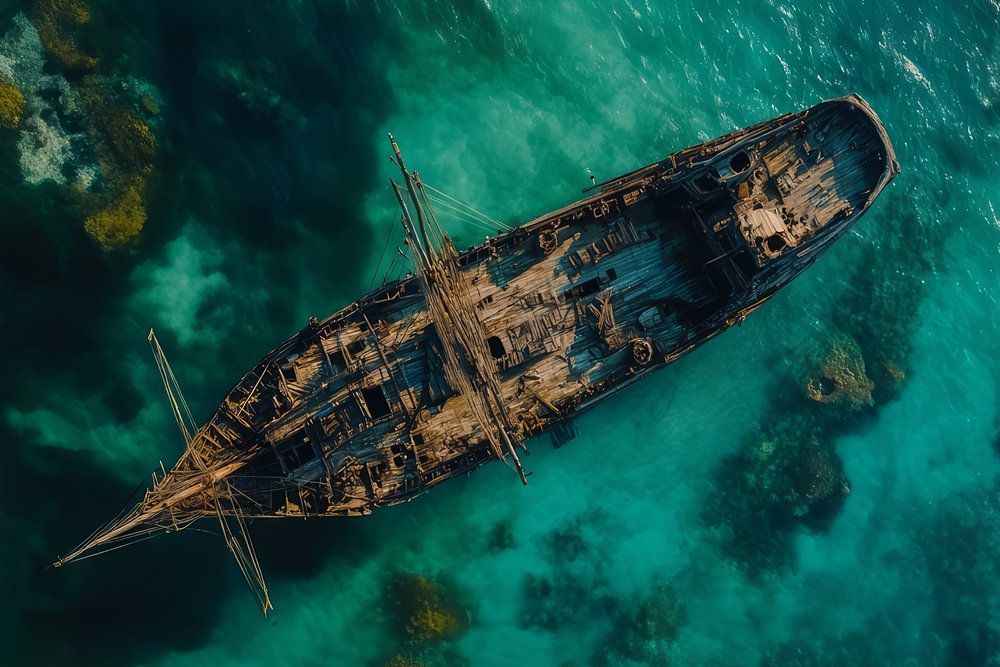 Een oud piratenschip, vervallen en mysterieus, ligt verlaten in de helderblauwe zee. Vanuit de lucht zie je de verweerde planken en het gebroken dek, ooit het toneel van avonturen op open water. Het schip lijkt als een verloren schat, omringd door kalm, glinsterend water dat zijn donkere verleden verbergt. Ruwe zeilen hangen gescheurd aan de masten en de romp is deels overwoekerd door algen en mosselen. Eenzaamheid en stilte hangen om het wrak, een stille getuige van verhalen die nooit zijn verteld. Dit verlaten schip, gehuld in vergeten glorie, wacht geduldig op een nieuwe ontdekking of een terugkeer naar de diepte.