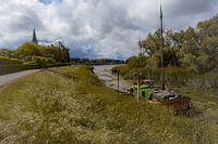 Een oud vrachtschip ligt aangemeerd in een idyllisch landschap met op de achtergrond de contouren van een klein dorp.