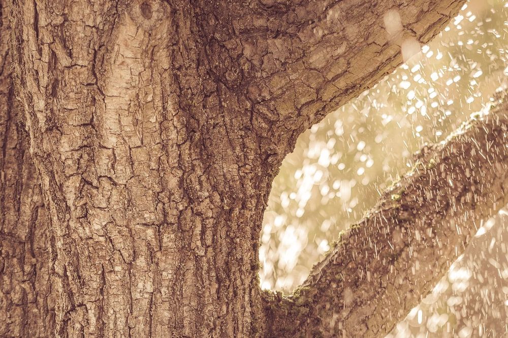 Op deze foto zie je een bijzonder patroon van opspattend water rondom de boom. Het is een verfrissende douche voor deze oude reus.