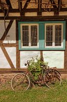 Een verroeste fiets achtergelaten voor een vakwerkhuis op een zomerse dag