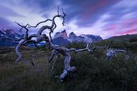 Zonsopgang in het Torres del Paine Nationaal Park in Zuid Chili. We zagen veel van dit soort (dode/of bijna dode) bomen. Ze maakten een mooie voorgrond voor de bergen van Torres del Paine.