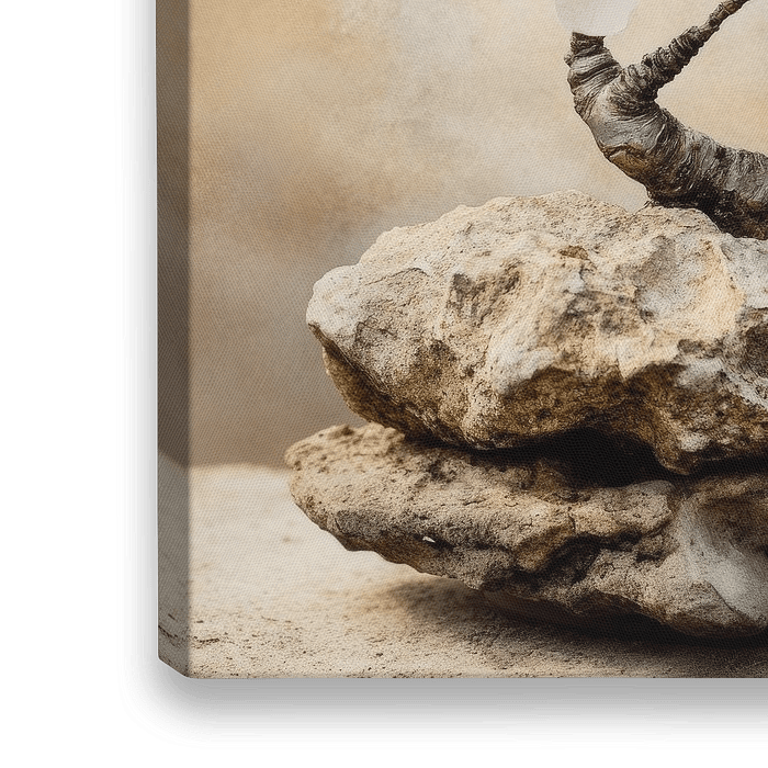 Een oude tak van een amandelbloesem bonsai staat centraal in dit stilleven. De grillige vorm van de tak, met fragiele bloesems die subtiel bloeien, contrasteert prachtig met de ruwe, stevige steen waarop hij rust. De steen lijkt te zijn neergelegd in fijn zand, wat een gevoel van natuurlijkheid en eenvoud uitstraalt. De beige…