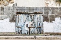 Een oude stadsmuur met een houten verweerde blauwe deur met kapotte ijzeren deurklinken. Op de deur staat de Engelse tekst Walk Night