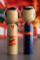 Een paar traditionele houten Japanese kokeshi poppen, man en vrouw