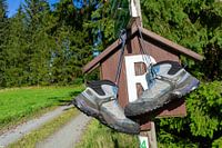 Een paar wandelschoenen op een wegwijzer op de Rennsteig in het Thüringer Woud