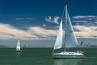 Een paar zeilschepen varen door de Baai van San Francisco (VS) met het eiland Alcatraz en de stad San Francisco op de achtergrond. Dit beeld, genomen vanuit het nabijgelegen stadje Sausalito, toont de zeer gunstige omstandigheden die in de Baai van San Francisco bestaan voor de beoefening van de zeilsport. Sausalito is een stadje gelegen aan de andere kant van de Golden Gate Bridge, dat uitkijkt op de Baai van San Francisco en bovendien een zeer gunstig microklimaat geniet, want terwijl de koude winden van de Stille Oceaan in San Francisco en haar baai waaien, wordt Sausalito daarentegen beschermd tegen de winden door een kleine heuvelrug.
