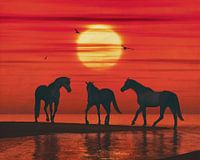 Een paard stopt even terwijl twee anderen naar hem toe lopen. De avondlucht kleurt rood omdat het zonsondergang is. Een paar meeuwen vliegen boven de zee. Dit aantrekkelijke werk is te koop in verschillende materialen en formaten.