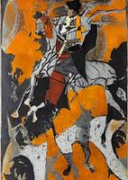 Collage met verf. Geabstraheerd in aardse teinten. Prachtig en eigentijds. Ruiter en paard zijn hier als uitgangspunt gebruikt om er een vervreemd kunstwerk van te maken. Met smaak voor u samengesteld.