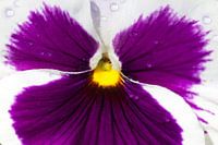 Een macro van een paars viooltje met druppeltje water op de bloembladeren,