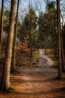 Een pad door het bos op de Veluwe. Op een mooie dag in de herfst zorgt de zon voor prachtige diepe, warme kleuren. Deze landschap foto zal geweldig staan als muur decoratie in elke kamer van uw huis of op kantoor!