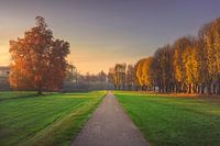 Een smal pad met prachtige bomen langs de muren van Lucca op een herfstochtend. Regio Toscane, Italië