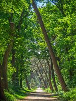 Langs oude bomen met frisse groene bladeren wandelen, heerlijk verfrissend en gezond voor je