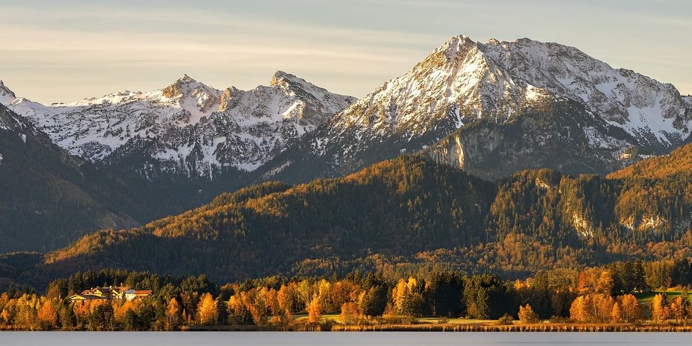 Koop dit landschapskunstwerk Een panormabeeld van de bergen aan de Hopfensee nabij Füssen in Zuid-Duitsland in de herfstperiode. van Marga Vroom op canvas, aluminium dibond, (ingelijste) fotoprint, behang en ArtFrame, op maat geprint in Fine-Art kwaliteit.