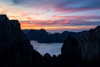 Een pastelkleurige zonsondergang gezien vanaf de berg Pico do Aieiro tijdens een cloud inversion (inversie) met hoge bewolking die de kleuren van de zon mooi weerkaatsen. De pieken van de bergen steken mooi door de inversie heen.