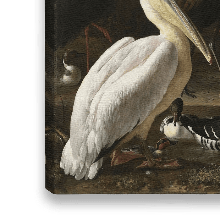 Koop Een pelikaan en ander gevogelte bij een waterbassin, 'Het drijvend veertje' als reproductie op canvas, aluminium dibond, (ingelijste) fotoprint, behang en ArtFrame, op maat geprint in Fine-Art kwaliteit.