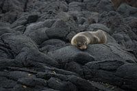 Een nog vrij jonge pelsrob doet zijn slaap op de rotsen bij het Albatross centrum in Dunedin