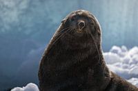 Een opname van een pelsrob op het strand in Antarctica met een ijsblok in de achtergrond. Opname genomen met een lange telelens.