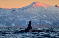 Een prachtige kalme dag midden in de Noorse winter. De zon de nog nauwelijks boven de hemel uitkomt en slechts de toppen van de bergen aanraakt en het geheel gecomplementeerd met een van de mooiste schepsel levend in onze oceanen... de orka!