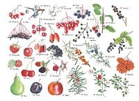 Een plaat vol vruchten; peer, appel, lijsterbes, bosbes, pruim, kers, duindoorn, vlierbes. Illustraties Jasper de Ruiter