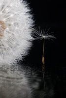 " Een pluisje houdt de pluizenbol vast" is een verticale macrofoto van een pluizenbol met een pluisje ernaast die liggen / staan op een waterig spiegelend oppervlak.