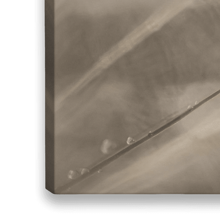 Koop de foto Een pluisje in een pluizenbol met druppeltjes (taupe en beige tinten) van Marjolijn van den Berg op canvas, aluminium dibond, (ingelijste) fotoprint, behang en ArtFrame, op maat geprint in Fine-Art kwaliteit.