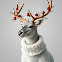 een minimalistische portret van een rendier met gewei versierd met kerst decoratie en wollen witte trui aan op een zachte licht beige witte achtergrond.