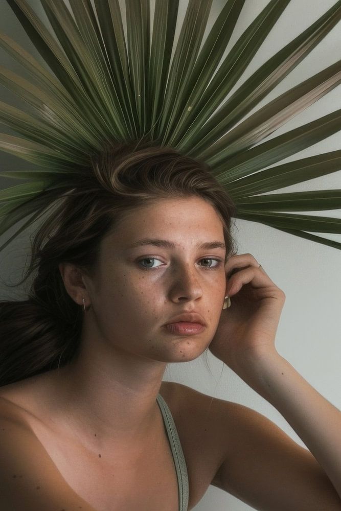 De afbeelding toont een jonge vrouw die op de grond zit terwijl ze een krans van bladeren draagt die omhoog reikt. De elegante opstelling van de palmachtige bladeren in combinatie met haar peinzende uitdrukking creëert een harmonieuze verbinding tussen mens en natuur. De zachte kleuren en minimalistische setting benadrukken haar gratie en het creatieve ontwerp van het portret.