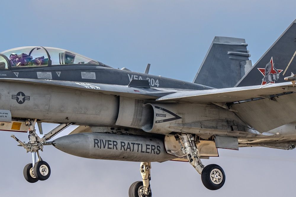 Een prachtige F/A-18D van VFA-204 "River Rattlers" tijdens de landing op Fort Worth Meacham International Airport gefotografeerd.