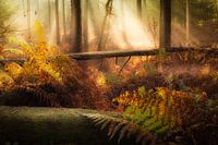 Een prachtige mystieke ochtend in het Nationaal park Veluwezoom met mist en zonneharpen in de herfst. Een omgevallen boomstam ligt op de voorgrond. Door de bomen schijnt het zonlicht van de ochtend. De warme tinten van het licht geven de warme tinten van de herfstkleuren een extra intensiteit. Een heerlijks herfstfoto waarbij je het bos…