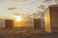 Een strandstoel liggend tussen verschillende strand hokjes aan het strand van Katwijk. Op de achtergrond de zee, ondergaande zon en wat wandelende mensen..............