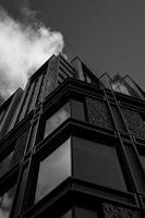 Een puntige structuur in Zwart-wit in Leiden met een aantal wolken.