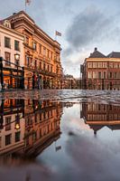 Een regenachtige dag in Utrecht - Deze betoverende foto toont een karakteristiek stadsbeeld van Utrecht tijdens het gouden uur op een regenachtige dag in januari. Het historische gebouw van de Winkel van Sinkel wordt prachtig verlicht, en de gevels van aangrenzende panden worden weerspiegeld in een plasje water op straat.