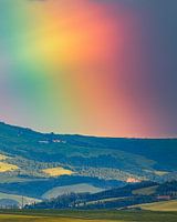 Een verticale 4:5 foto van een enorme regenboog in avondlicht, gemaakt met een 500mm lens, in Toscane, in Val d'Orcia, midden-Italië,