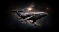 Een reusachtige walvis zweeft majestueus door de oneindige uitgestrektheid van het heelal, alsof hij gewichtloos door een zee van sterren glijdt. Verre sterrenstelsels en stralende sterren glinsteren op zijn lichaam, waardoor het een bijna mystieke aanwezigheid krijgt. De oneindige duisternis van de ruimte, onderbroken door sterrenlicht en kosmische nevels, versterkt de indruk van eenzaamheid en stilte.