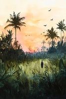 In het zachte licht van de zonsondergang strekt zich een magisch landschap uit waar hoge palmbomen de hemel raken. Een eenzame reiziger staat tussen het weelderige gras en kijkt naar de vogels die in zachte bogen door de avondlucht vliegen. De kleuren smelten samen in een harmonieus samenspel dat rust en verlangen uitstraalt.