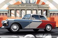 Een retro auto op een stadsstraat met bomen van een boulevard.