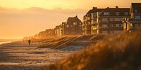 Een rij huizen omzoomt een sereen strand met zacht, goudkleurig licht dat weerkaatst op het zand.