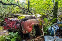 Als het decor van een post acopalyptische zombiefilm. Bastnas Auto kerkhof in Zweden. In de bosrijke omgeving van het gehucht Bastnas , ongeveer twintig kilometer onder het plaatsje Tocksfors, op de grens tussen Zweden en Noorwegen ligt een verlaten autokerkhof. Het resultaat van een auto onderdelen handel van twee Zweedse broers die voornamelijk zaken deden met Noorse klanten. Het omvangrijke terrein bevat enkele huizen en bijgebouwen, en is vrij toegankelijk als je je aan de regels houdt. Je mag de gebouwen niet binnentreden, en niets van het terrein meenemen. Nadat de twee broers gestopt zijn met hun bedrijf, neemt de natuur het terrein weer over. Een oude rode Saab 96 overwoekerd met mos, lijkt zo uit het bos te willen rijden. Deze foto is gemaakt met een Fujifilm X-T3 gemonteerd op een statief tijdens een regenachtige Zomerdag in 2022