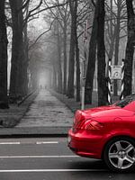 Een retro stadsbeeld van de maliebaan in Utrecht met een moderne rode auto die niet alleen een contrast geeft door zijn kleur, maar ook met de ouderwetse fiets op het bordje.