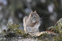 Een rode eekhoorn bij de voederbak van Claude Laprise