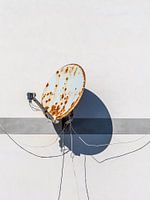 Een roestige satallietschotel met loshangende bedrading bevestigd aan een witte muur.