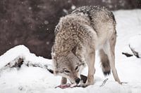 Een roofzuchtige en hebzuchtige wolf knaagt gretig aan een stuk vlees dat zich met een wolvengebaar omkeert (wolvenhouding), het sneeuwt, er ligt sneeuw. wolvengedrag in de winter.