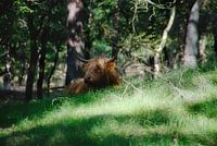 Een rustende schotse hooglander in het bos op het Groote Zand bij Hooghalen.