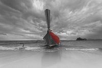 Een eenzame longtailboot rust rustig uit op de kust van Koh Ngai Island - een moment bevroren tussen storm en stilte. De lucht is zwaar, de donkere regenwolken hangen laag boven de Andamanse Zee alsof ze de zee willen opslokken. In dit dramatische landschap trekt een rode doek die om de boeg van de boot is gewikkeld op magische wijze de…