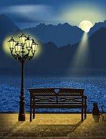 Een rustige en romantische patio met een bankje aan het meer. De maan schijnt mystiek over de bergen. Een lamp, kat en een bankje in het park als silhouetten tegen een blauwe achtergrond.