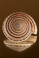 "Een schelp met een spiraal in bruintinten" is een foto van een prachtige schelp, volgens mij een huisje van een Architectonica Perspectiva (ook wel een zonneslak genoemd).
